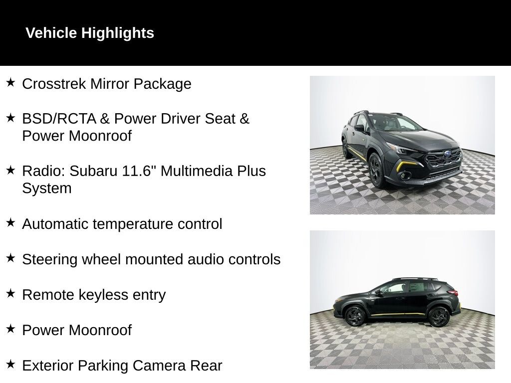 Highlighted by a bold and sophisticated exterior, the 2025 Crosstrek Sport commands attention with its striking Black finish and sleek, aerodynamic lines. Beneath the surface, this vehicle is equipped with a powerful 2.5L 4-Cylinder DOHC 16V engine, paired with a Lineartronic CVT and Subaru's renowned Symmetrical All-Wheel Drive system, delivering an impressive blend of performance and efficiency with 27 city/33 highway MPG.