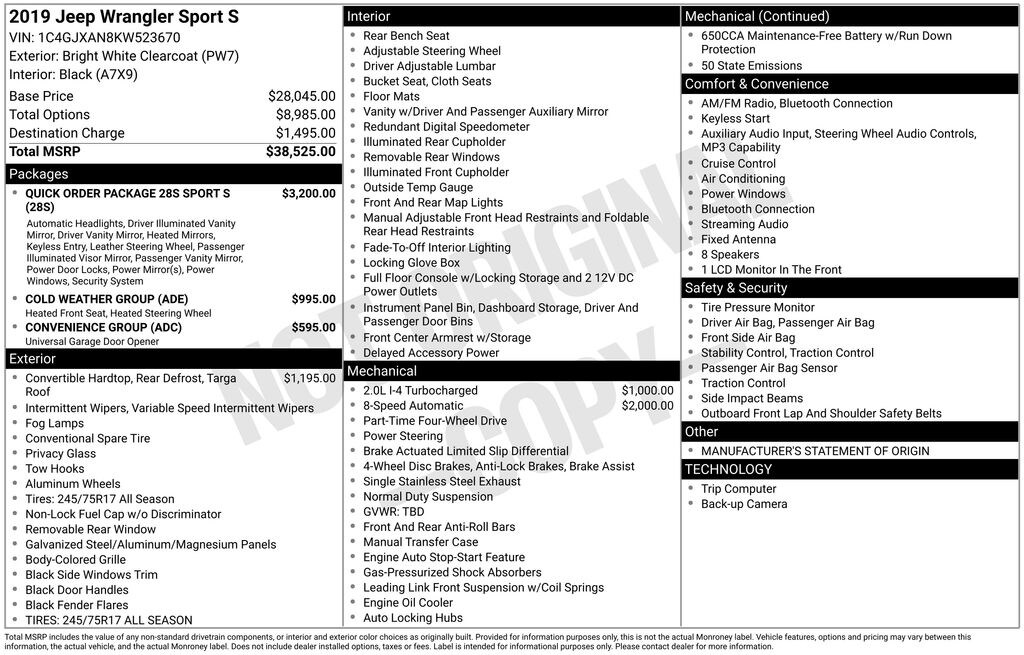 Recent Arrival! 2019 Bright White Clearcoat Jeep Wrangler Sport S 4WD 4WD, Air Conditioning, Cold Weather Group, Convenience Group, Heated Front Seats, Heated Steering Wheel, ParkView Rear Back-Up Camera, Remote Keyless Entry, Steering wheel mounted audio controls, Universal Garage Door Opener.