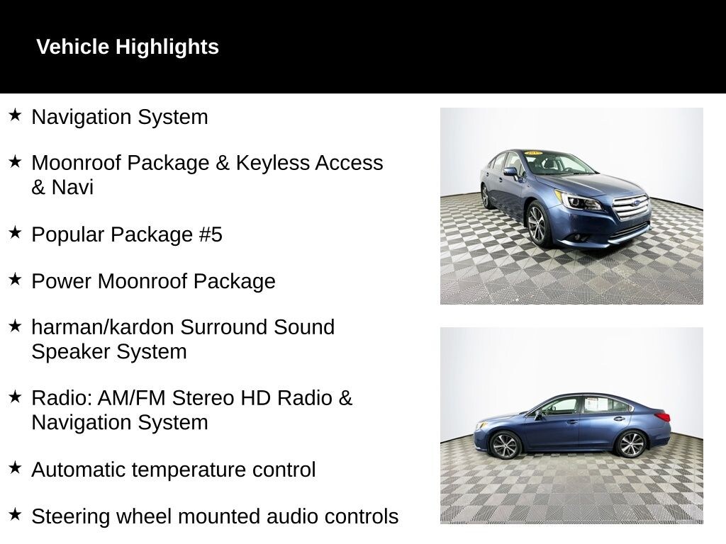 Moonroof, Moonroof Package & Keyless Access & Navi, Power Moonroof Package, Multi-zone Temperature Control, Keyless Entry, Steering Wheel Mounted Audio Controls, Fog Lights, Cruise Control, Heated Mirrors, Splash Guards, All Weather Floor Mats, Legacy Cargo Tray
