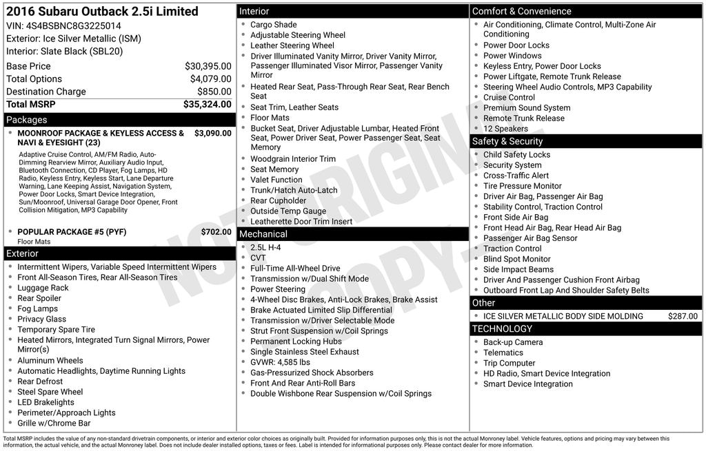 • Moonroof Package & Keyless Access & Navi & EyeSight