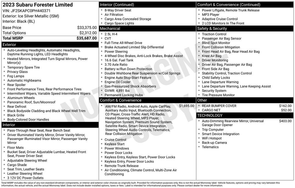 - Radio: Subaru Starlink 8.0" Multimedia Nav System
