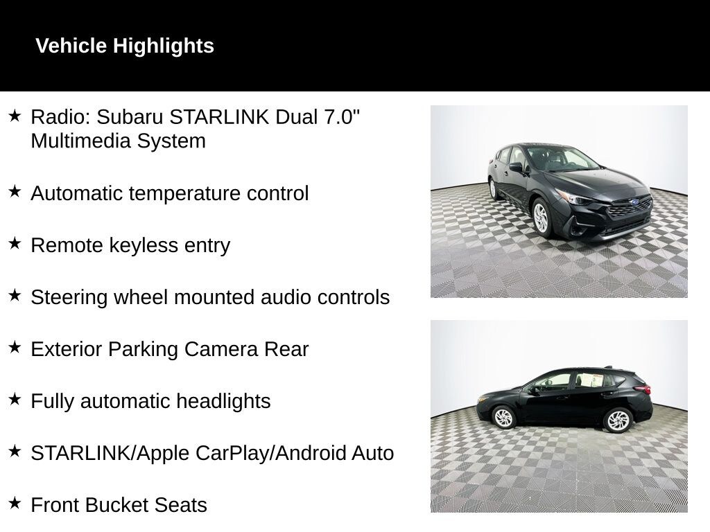 Sirius XM|Back-up Camera|Alloy Wheels|Wheels: 16in x 6.0in Full Cap 1/2 J Steel|Cloth Upholstery|Radio: Subaru STARLINK Dual 7.0in Multimedia System|Cargo Tray|All-Weather Floor Liners|Rear Seatback Protector|4 Speakers|STARLINK/Apple CarPlay/Android Auto|Auto High-beam Headlights|Exterior Parking Camera Rear|AM/FM radio: SiriusXM|Front beverage holders|Variably intermittent wipers|Trip computer|Traction control|Tilt steering wheel|Telescoping steering wheel|Steering wheel mounted audio controls|Split folding rear seat|Speed-sensing steering|Speed control|Security system|Remote keyless entry|Rear window wiper|Rear window defroster|Radio data system|Power windows|Power steering|Power door mirrors|Passenger vanity mirror|Passenger door bin|Panic alarm|Overhead console|Overhead airbag|Outside temperature display|Occupant sensing airbag|Low tire pressure warning|Knee airbag|Illuminated entry|Fully automatic headlights|Front reading lights|Front dual zone A/C|Front anti-roll bar|Four wheel independent suspension|Dual front side impact airbags|Dual front impact airbags|Driver vanity mirror|Driver door bin|Bumpers: body-color|Brake assist|Automatic temperature control|Anti-whiplash front head restraints|ABS brakes|Tachometer|Spoiler|Front Center Armrest|Front Bucket Seats|Electronic Stability Control|Air Conditioning|4-Wheel Disc Brakes