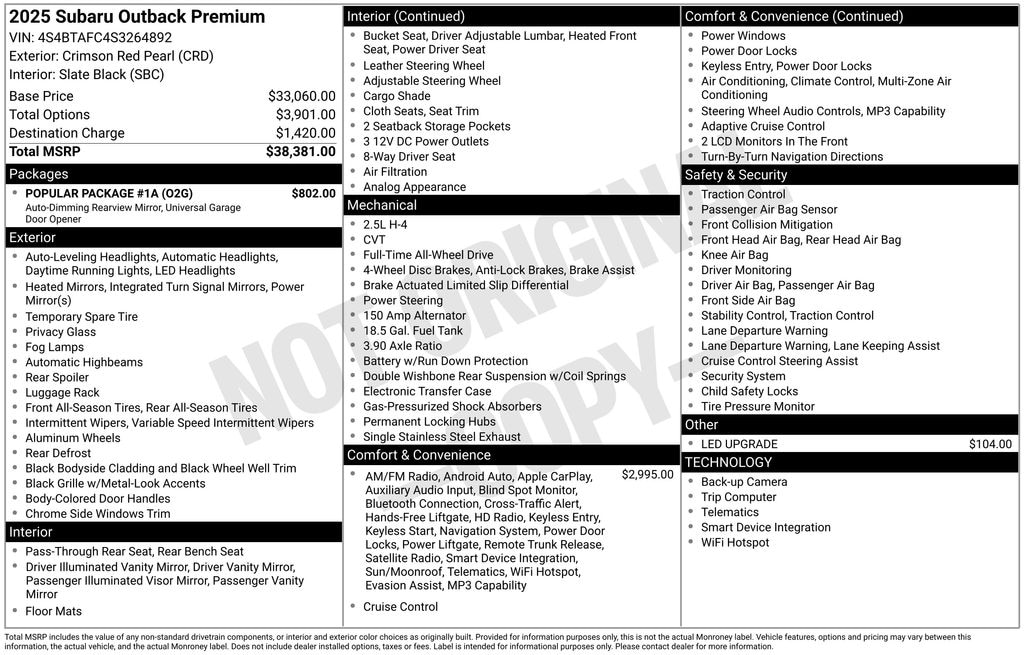 Recent Arrival! 2025 Crimson Red Pearl Subaru Outback Premium AWD AWD, All-Weather Floor Liners, Auto-Dimming Mirror w/Compass & HomeLink, Automatic temperature control, Blind Spot Detection (BSD), BSD & RCTA & Keyless Access & Push Button Start, Hands-Free Power Rear Gate, Keyless Access w/Push Button Start, Popular Package #1A, Power Moonroof, Radio: Subaru 11.6" Multimedia System w/Navigation, Rear Bumper Cover, Rear Cross Traffic Alert (RCTA).