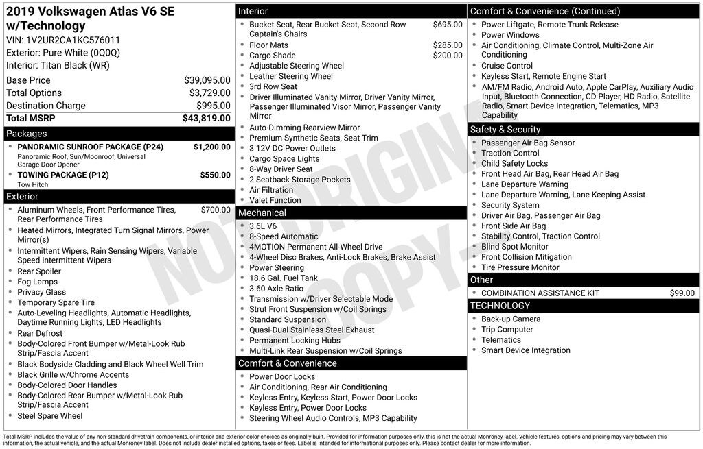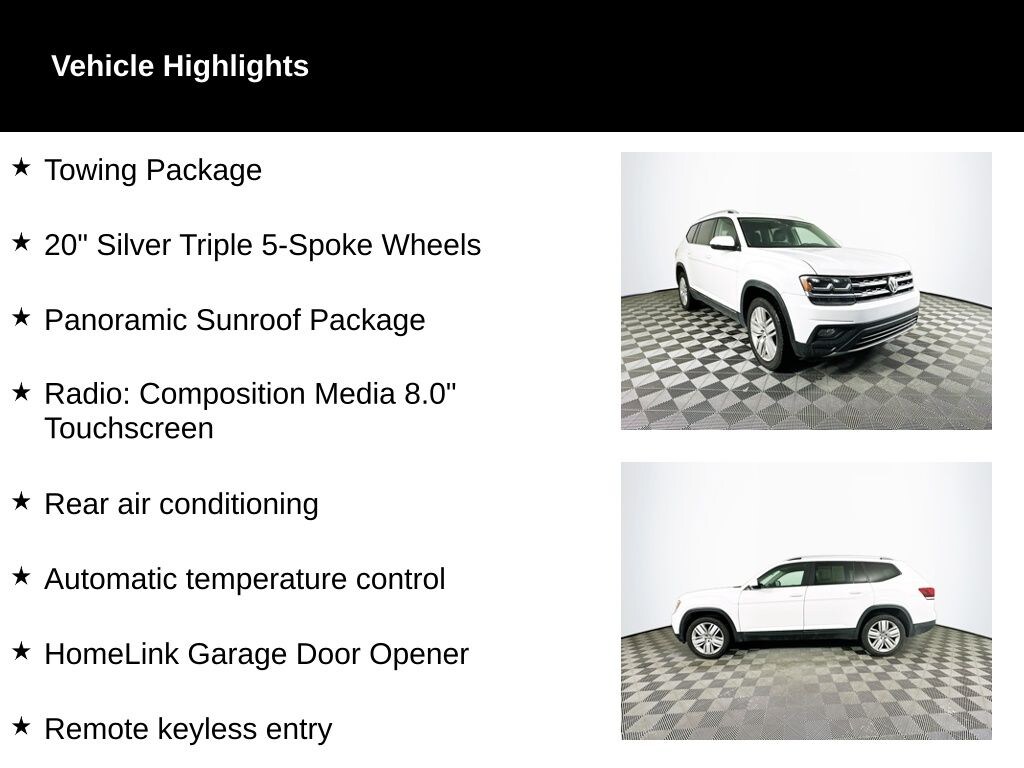 Recent Arrival! 2019 Pure White Volkswagen Atlas 3.6L V6 SE AWD AWD, 20" Silver Triple 5-Spoke Wheels, Automatic temperature control, Exterior Parking Camera Rear, Front Bucket Seats, Heated Comfort Front Bucket Seats, Heated front seats, HomeLink Garage Door Opener, Panoramic Sunroof, Panoramic Sunroof Package, Power driver seat, Power Liftgate, Radio: Composition Media 8.0" Touchscreen, Rear air conditioning, Remote keyless entry, Steering wheel mounted audio controls, Towing Package, Wheels: 20" Silver Triple 5-Spoke Alloy.